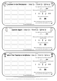 Chicken In The Fencepost and More - tika-tika Rhythmic Dictation Dictation worksheets for "Chicken in the Fencepost",...